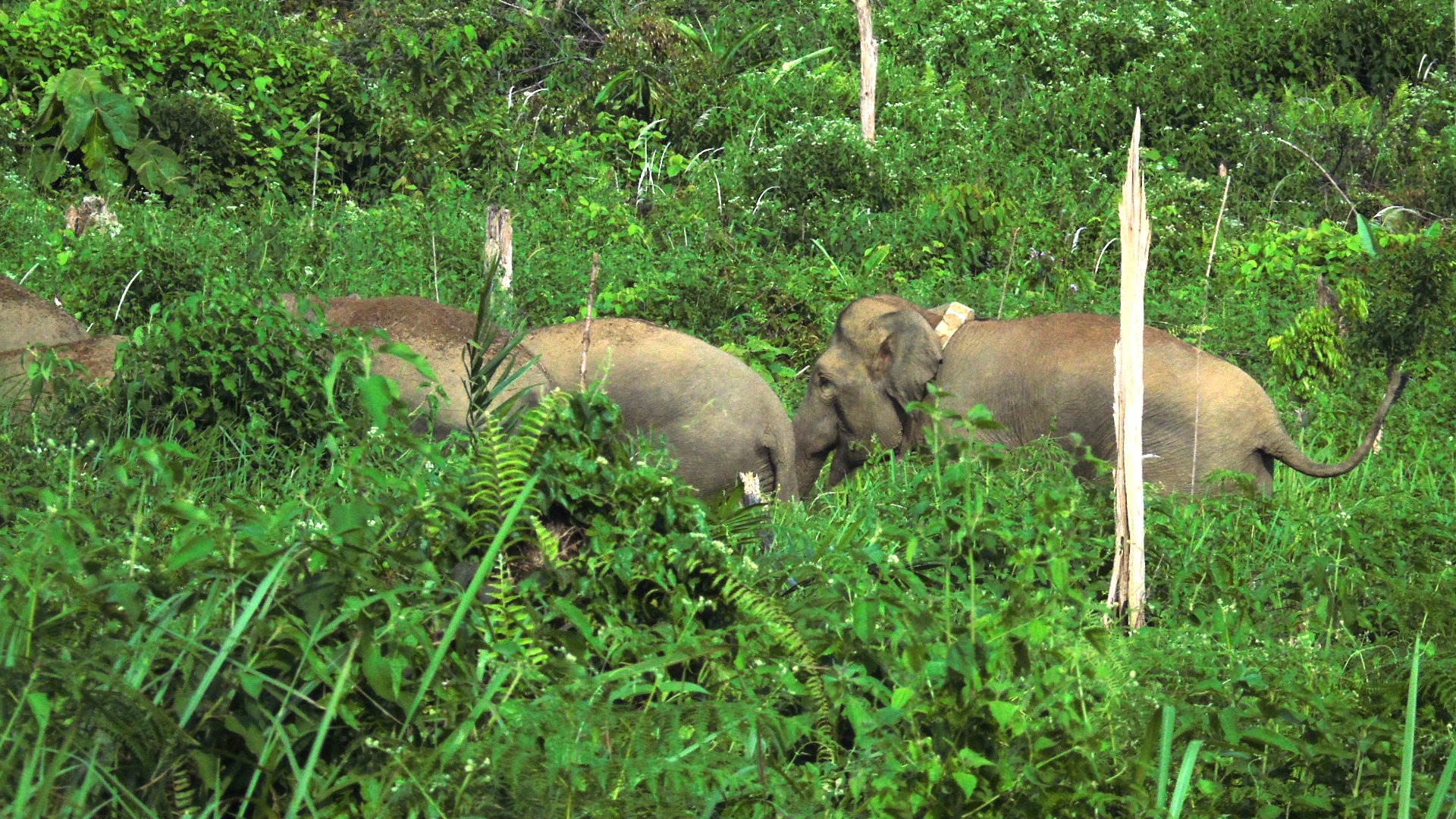 Interestingly, rangers have noticed that fewer elephants are now following Freda each time she commences traveling to the TMA concession. Initially, more than 20 elephants used to follow her and now only six females still do. The rest joined other herds and stayed in LAJ/RLU and ABT Block I. We believe that only core family members still follow on this very stressful journey, while loosely attached family members prefer to stay in safer areas with other elephants. This confirms once more a behavior that we have observed many times before in the Bukit Tigapuluh landscape: fission-fusion. Herds don’t seem to be as fixed and stable as first thought and instead undergo changes in both structure and total numbers of individuals. We believe that small core family groups of 3-10 elephants are the only really stable structure. These small families then join others to form herds, and break off again after weeks, months, or even years, to join other elephants again.