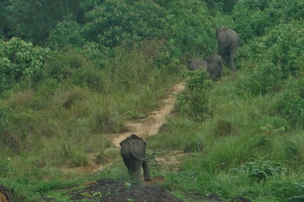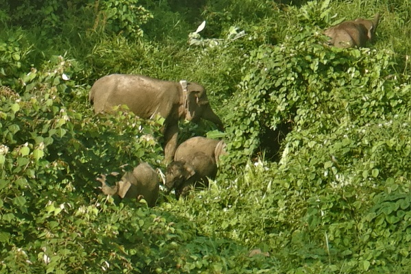 Our officer who in charge of the Early Warning System, sent updates to local community groups every morning and evening to let them know the locations of the elephants. This allows the community members to safely guard their crops with techniques taught to them by the elephant monitoring teams. This is to reduce human-elephant conflicts. The video and photos below shows Ginting grazing and traveling in the forest with other herd members.