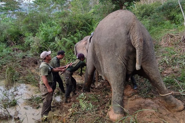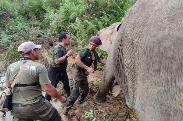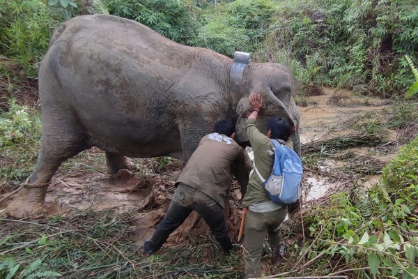 In an exciting update, Ginting has been seen with a newborn calf however the sex of the calf has not yet been identified. Ginting has also been fitted with a new GPS collar so the team can continue to monitor Ginting and her herd closely and protect them from any harm. These photos show the team hard at work during the collaring procedure. Many team members including veterinarians are needed to safely collar the elephants and it is a huge task to undertake. Firstly, Ginting was sedated via a dart gun. The team then worked quickly to put a new GPS collar on. The well-being of the elephant is closely monitored during the entire procedure. Once the collar is fitted, Ginting was given a reversal drug and monitored to ensure she reunited with her nearby herd. Well done to everyone involved!