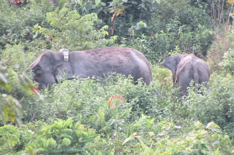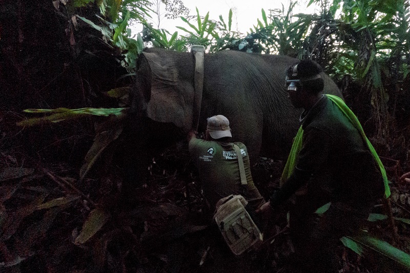 As the team finished removing Freda’s old collar, the team was approached by two male elephants and chased. All members of the team had to flee from the protective elephants and thankfully, no one was hurt. This event highlights how risky procedures with wild elephants can be. The team involved with collaring elephants in the Bukit Tigapuluh Ecosystem is very experienced and of course we only put GPS collars on these elephants since they are a vital tool in allowing our monitoring teams to follow and protect the Critically endangered Sumatran elephant herds.