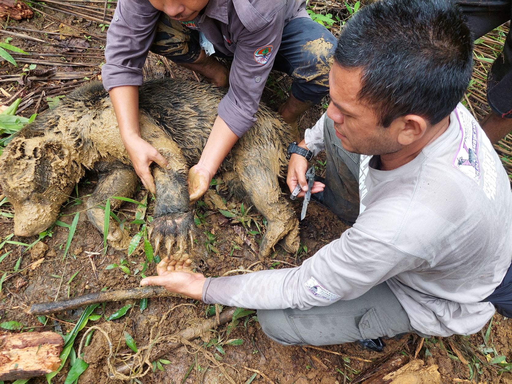Above: Before they could tend to the sun bear's wound, the team needed to rescue her from the snare, which you can see in the foreground, and lift her out of the mud