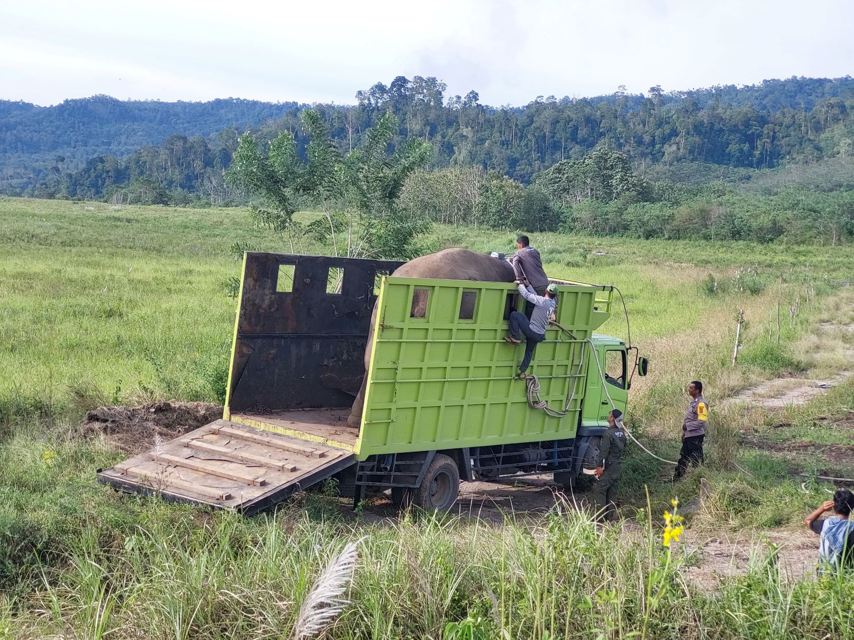 As Gesang had raided crops in this Aceh village on at least two other occasions, the team insisted that a GPS collar be fitted. They wanted to ensure rangers could monitor Gesang, to document his migration and ensure that they can identify him easily in the future. To attach the GPS collar, Gesang was sedated with a dart gun, and with the help of some tractors, he was slowly moved to a location where he could then be put on a truck.