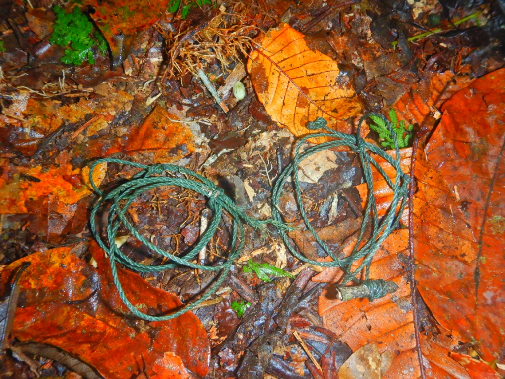 The kind of snare Senamo stepped in was a sling snare. This is a simple contraption that involves tying rope, cord or wire to a young sapling. The tree is bent over and the snare is fixed into place. When an animal like Senamo steps into the loop of wire or rope hidden under leaves on the ground, the sapling springs up and the rope becomes tight around the animal’s foot. It’s a terrible way to die, and the panic and pain animals suffer while they’re lying there in the forest is insurmountable. Below you can see just a rope snare removed from the forest by rangers in Sumatra.