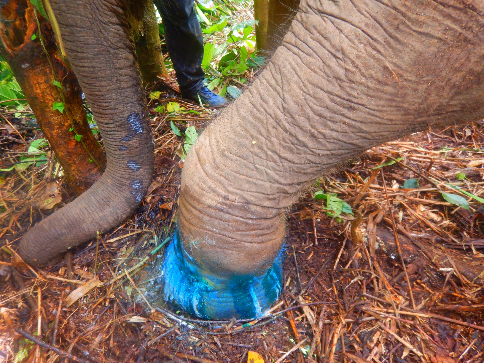We all breathe a sigh of relief when the vets tell us that, although the rope has cut into the flesh, it’s not too deep. The elephant will be able to recover fully, although that may take a couple of weeks. The vets clean the wound, apply anaesthetic and antibiotics to the wound - it stains the skin and flesh blue. They also take blood by inserting a needle into one of the large veins in the elephant’s ear and collect faeces to carry out other health checks. The medical checks will help them treat the elephant for other diseases to help her recover more quickly.