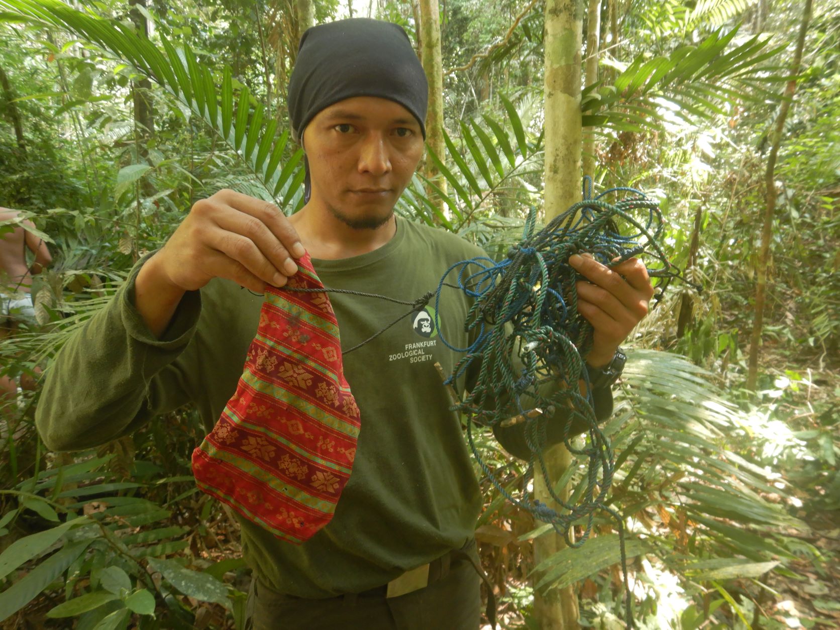 Above: A wildlife ranger with a number of snares as well as a small pouch to catch songbirds for sale in the wild bird markets