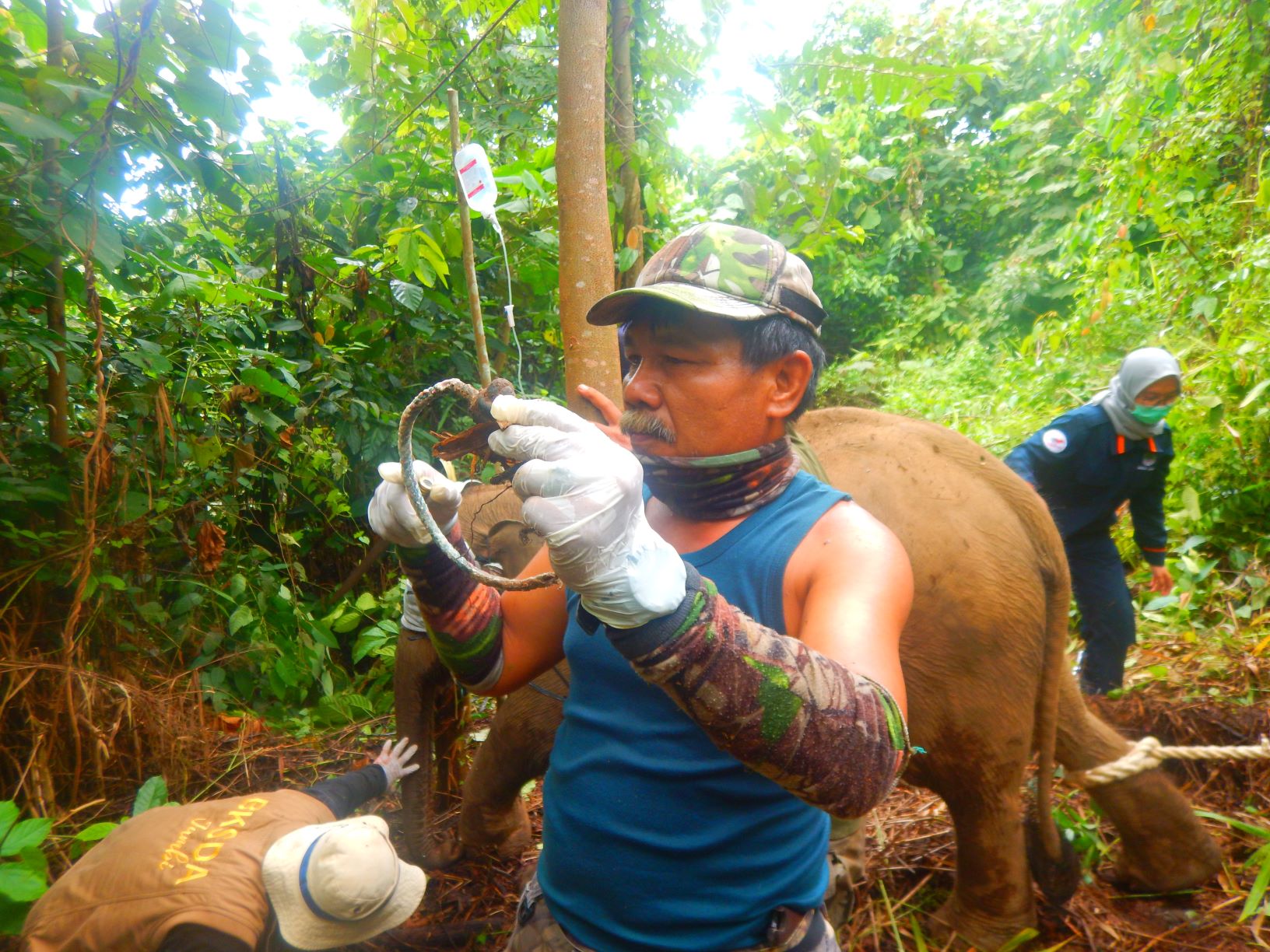 Along with the BKSDA and their veterinarians, we work together to tranquilise the small elephant so she doesn’t struggle. Our team leader cuts the snare so it is no longer pulling on the elephant’s leg. We carefully remove the rope from the wounded leg and the vets step in to inspect the wound.