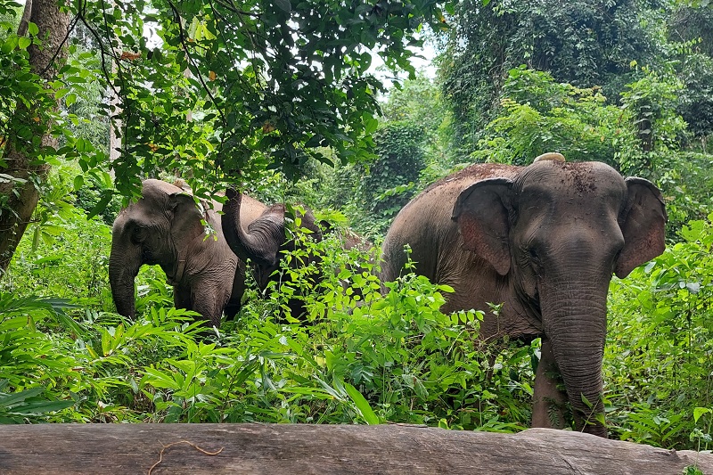 This year saw huge rainfall in Laos, which motivated many local elephant owners to release their elephants into the forest in a semi-free roaming setting, so they did not have to take care of them during the difficult weather. This meant that the released elephants from the Elephant Conservation Center were not the only elephants roaming free in this area for a while. This may have incentivized curious Dor Khoun Mueang to go looking for new friends. The tracking team found Dor Khoun Mueang with his biological mother on several occasions and they sometimes stayed together for days at a time. Dor Khoun Mueang’s mother has also just had a new baby boy, so he got to meet his little brother too!