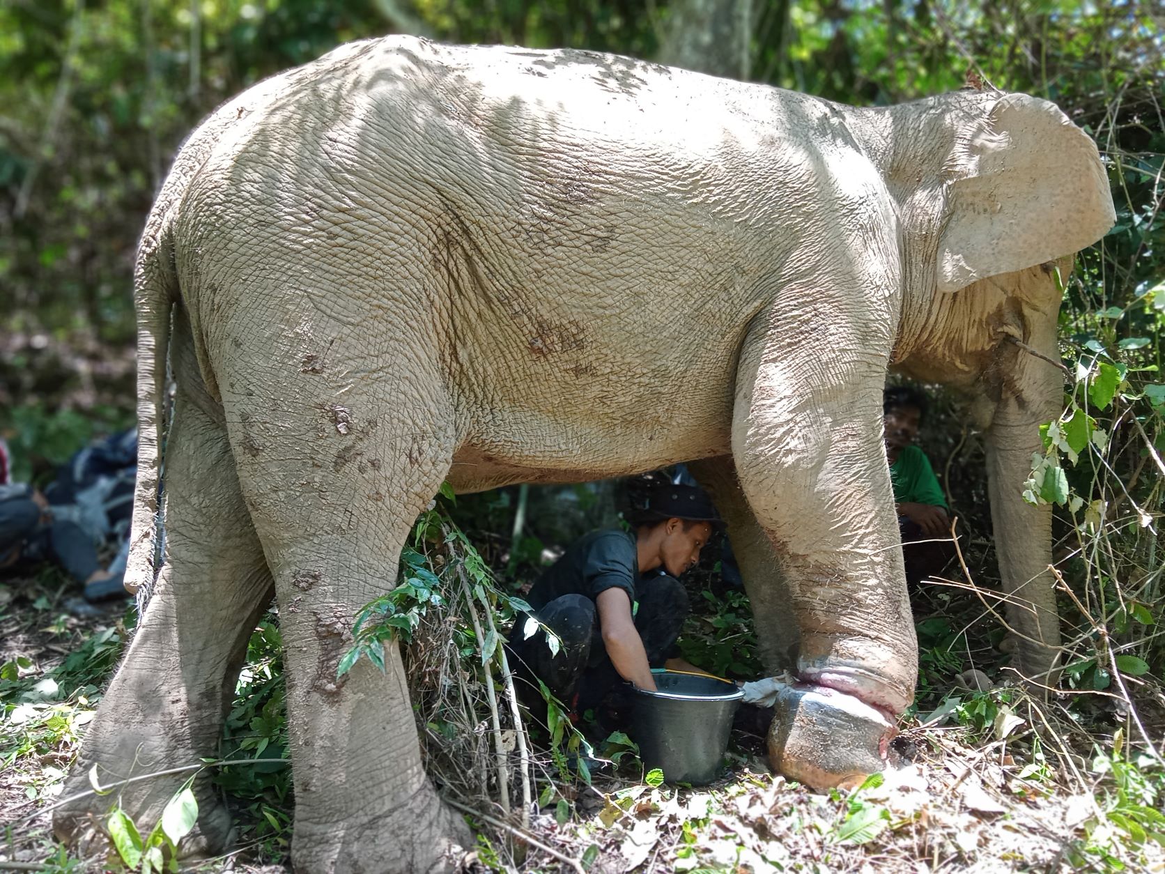 You may remember that Senamo, a thirty-year-old elephant, had become trapped in a sling snare in the Leuser ecosystem in Sumatra. Although she managed to break the rope that was holding her in place, it was still embedded in her foot. An injury like this can lead to death.
