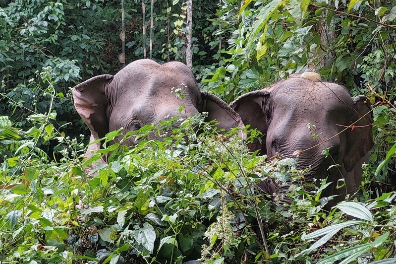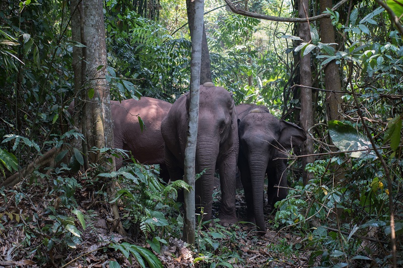 In January, Dor Khoun Meuang gave the release team a real scare as he became quite unwell. Thankfully, the team was able to identify that something was wrong due to a lack of movement from his GPS collar signals. The general movement of the released elephants seems to follow a pattern of spending one to three days in a small space of a few hectares before moving on to new feeding grounds. However, on the rare occasions that Dor Khoun Mueang leaves his surrogate herd to explore on his own, he tends to be more active. This behavior is normal for a male of his age in the wild, as they explore new areas independently, typically trying to associate with adult wild males.
