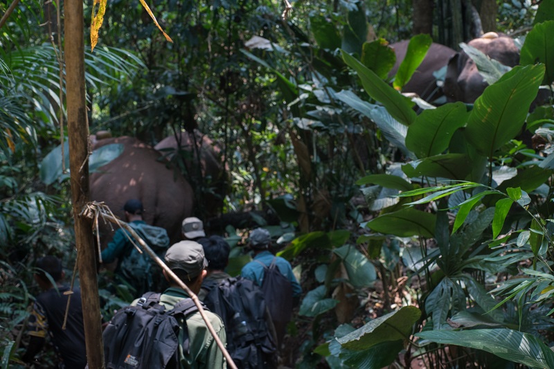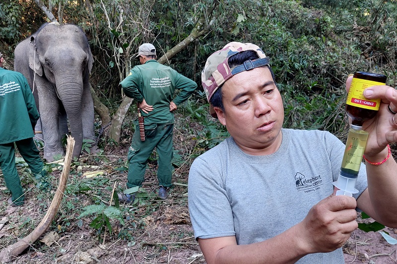 The tracking team moved Dor Khoun Mueang to a more accessible area of the forest on the third day of treatment. This allowed staff to drive to the area with a 4x4 car in less than an hour instead of the 2.5-hour tractor trip at the location where he was found.