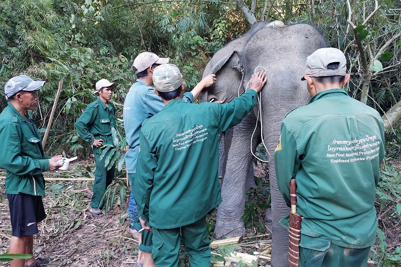 After a few days of solitary roaming, the team noticed a lack of movement from Dor Khoun Meuang’s GPS collar data. The team set out to search for him but could not find him on the first day. They searched again the next day and thankfully the team found Dor Khoun Meuang at 10am. However, he appeared weak and was not eating. It was suspected that he may have had a bacterial infection that had led to dehydration. The veterinary assistant and team then spent the next four days in the forest looking after Dor Khoun Meuang and giving him lifesaving treatments including IV fluid administration, anti-biotic treatment, pain relief, cathosal (vitamin treatment) and Biosan TP (energy restoration treatment)