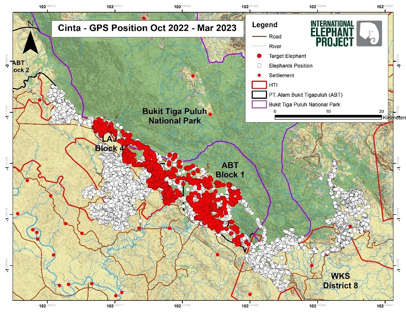 Cinta's herd also traveled in the WCA area and along the border of Bukit Tigapuluh National Park. From December 2022 – January 2023, Cinta’s herd mostly spent time in the Mendelang, Pekundangan and Manggatal river areas. This resulted in human-elephant conflict incidents, so our Elephant Conservation and Monitoring teams were kept very busy. Thankfully, these elephants moved back to a safer area with low human interaction from February-April.