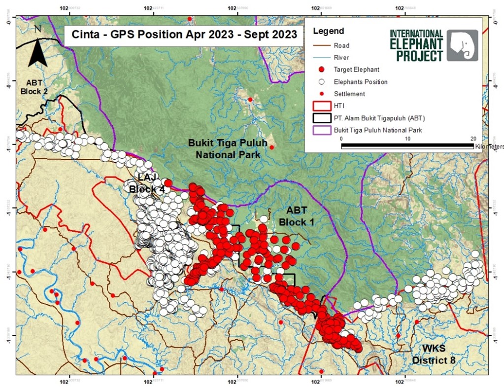 Cinta’s herd has been spending most of their time in our leased concession area (ABT Block 1) in the Bukit Tigapuluh ecosystem.